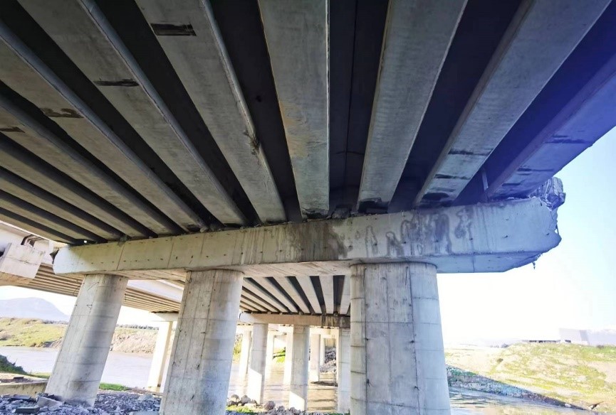 2月15日,對營地附近的一座橋梁進(jìn)行了觀察(圖1)。該橋梁為一座雙向五跨雙墩簡支梁橋。地震發(fā)生時(shí)河岸兩地劇烈晃動(dòng),兩岸場地帶動(dòng)橋臺相向運(yùn)動(dòng),橋梁受擠壓整體向上抬起。