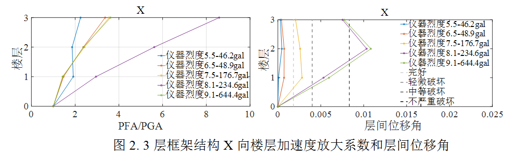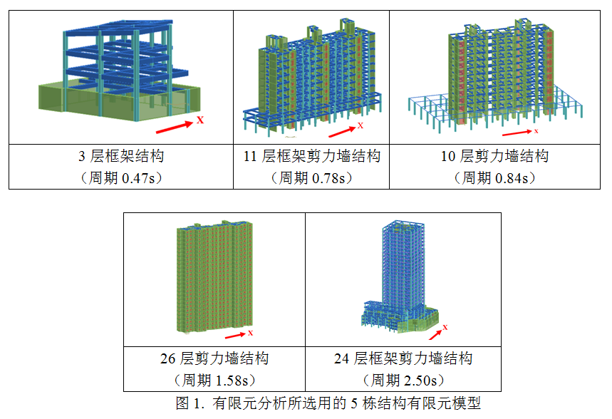為評估結(jié)構(gòu)在此次地震動的破壞水平,選取了實際記錄到的儀器烈度對應(yīng)的5組強(qiáng)震記錄,開展了針對當(dāng)?shù)乜拐鹪O(shè)防烈度為8度0.2g的5棟典型鋼筋混凝土結(jié)構(gòu)房屋的非線性動力響應(yīng)時程分析。5棟結(jié)構(gòu)包括1棟框架、2棟框剪及2棟剪力墻,結(jié)構(gòu)基本周期從小到大分別是0.47s,0.78s,0.84s,1.5s和2.5s。分析主要給出了對結(jié)構(gòu)安全和建筑內(nèi)人員體感影響明顯的層間相對位移和樓層加速度響應(yīng)結(jié)果。表2為選取的地震動記錄相關(guān)信息。圖1為選取的5棟結(jié)構(gòu)的有限元模型示意圖,圖2至圖6為五棟結(jié)構(gòu)的初步分析結(jié)果。